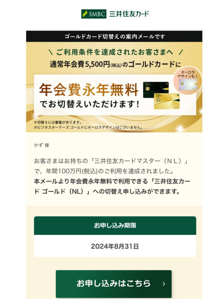 100万円修行を達成することで年会費無料で三井住友カードゴールド(NL)へアップグレードできるお知らせが届きます。